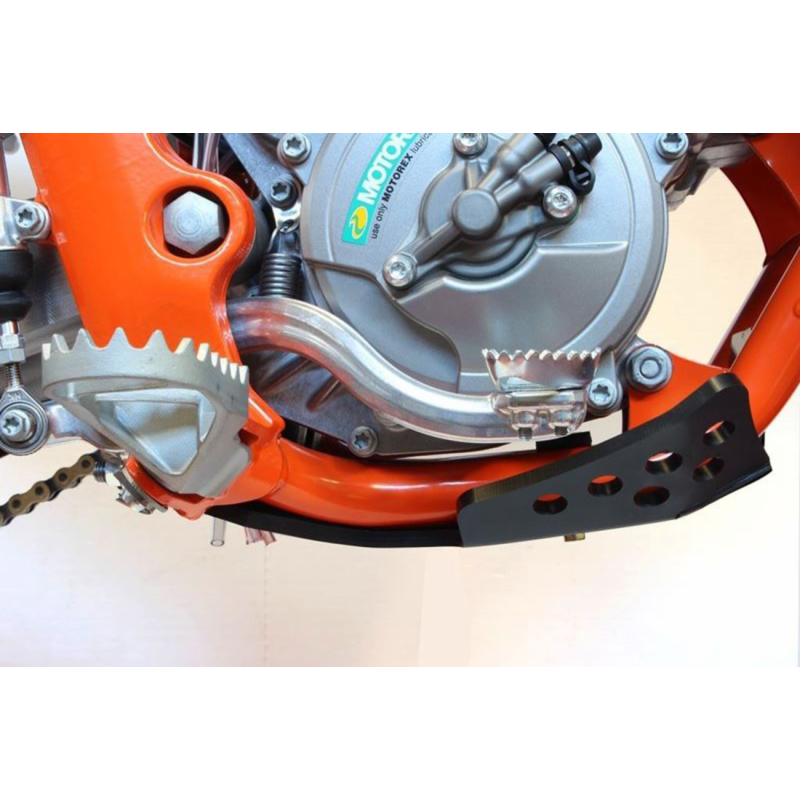 Made from 6 mm thick polyethylene, it covers the underside of the frame, protects the lower engine and crankcases from projections